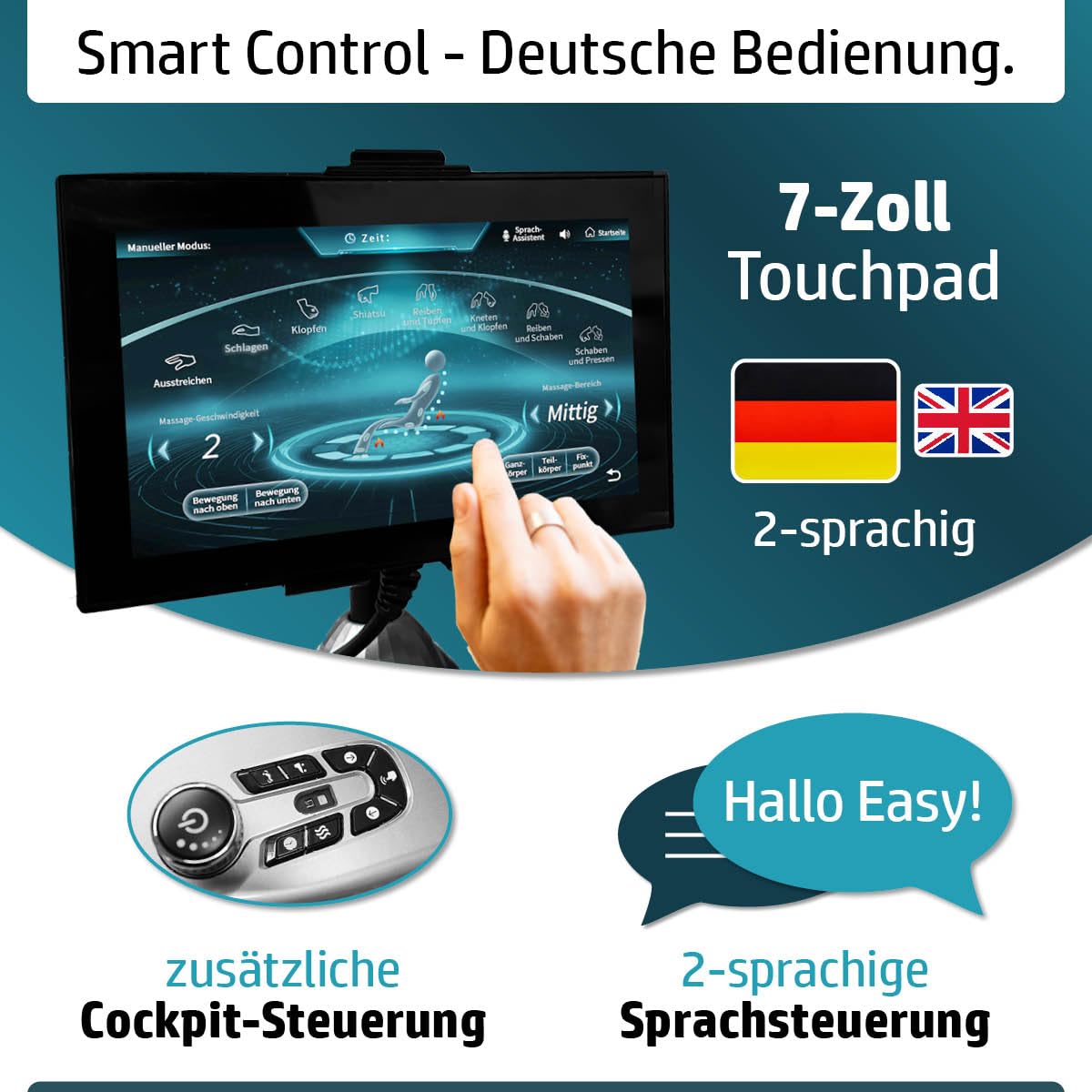 - 𝐄𝐢𝐧𝐟𝐚𝐜𝐡𝐞 𝐁𝐞𝐝𝐢𝐞𝐧𝐮𝐧𝐠 𝐚𝐮𝐟 𝐃𝐞𝐮𝐭𝐬𝐜𝐡: Genießen Sie höchsten Bedienkomfort mit einer Menüführung und bequeme Sprachsteuerung vollständig auf Deutsch oder alternativ auch auf Englisch – für eine entspannte, intuitive Nutzung des AMBINESS Massagestuhls. Gesteuert wird über das 7 Zoll Farb-Touchpad oder das integrierte Cockpit. Integrierte Bluetooth-Boxen, kabelloses Laden und Smartphone-Halterung runden das komfortable Erlebnis funktional ab