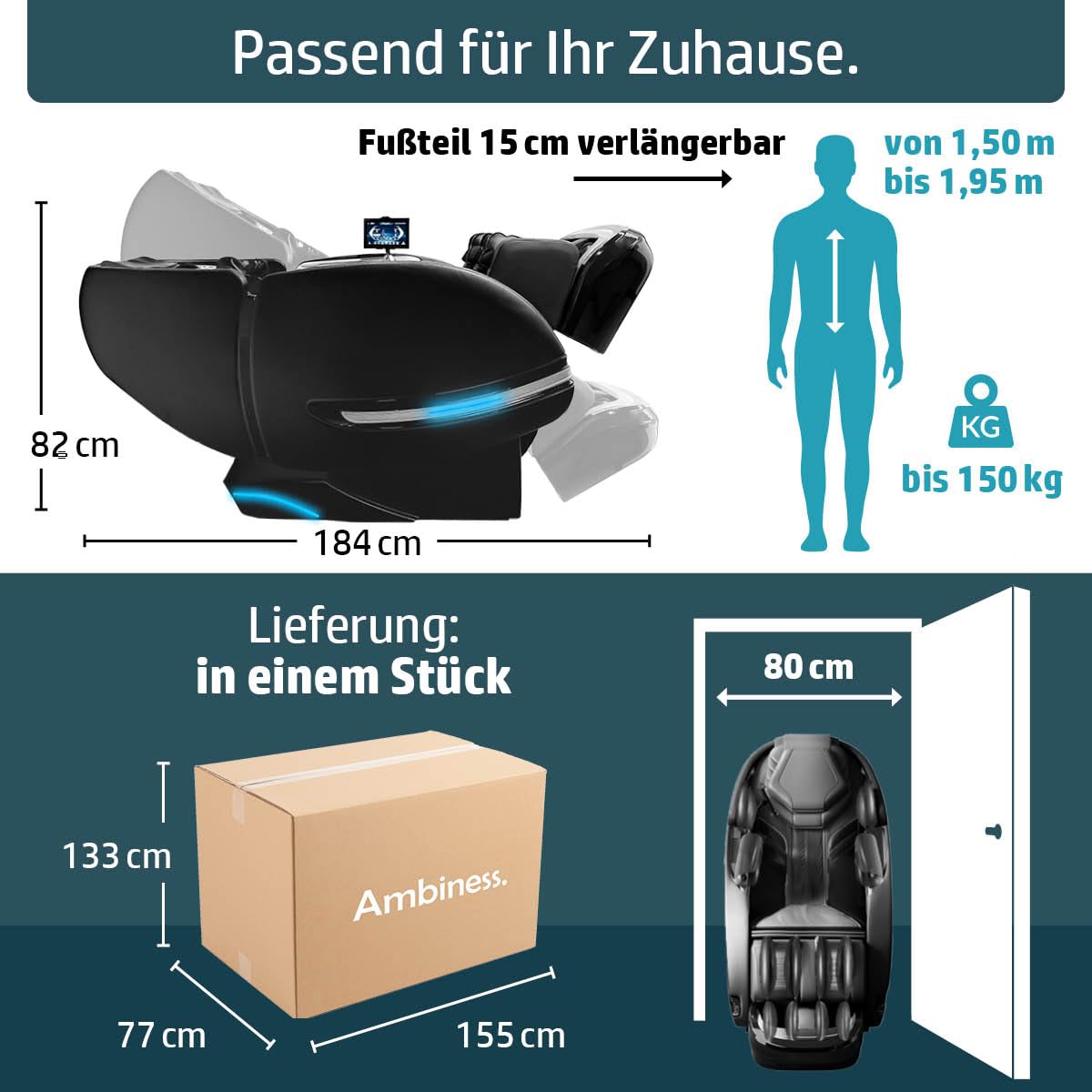 - 𝐓𝐞𝐜𝐡𝐧𝐢𝐬𝐜𝐡𝐞 𝐃𝐚𝐭𝐞𝐧: Maße: 162x75x114cm, Maße Liegeposition: 183,5x75x82cm, Breite Schulterposition: 65cm, Sitzbreite: 51cm, Sitztiefe: 51cm, herausziehbares Fußteil 15cm, Material: Kunstleder, Vitalwertbestimmung, Ambientebeleuchtung, Gewicht: 74kg, Menüsprache und Sprachsteuerung auf Deutsch, 172° Liegeposition, geeignet für Personen mit 150-195cm Körpergröße, Belastung bis 150kg, WICHTIG: nicht für Schwangere und Personen unter 14 Jahren geeignet